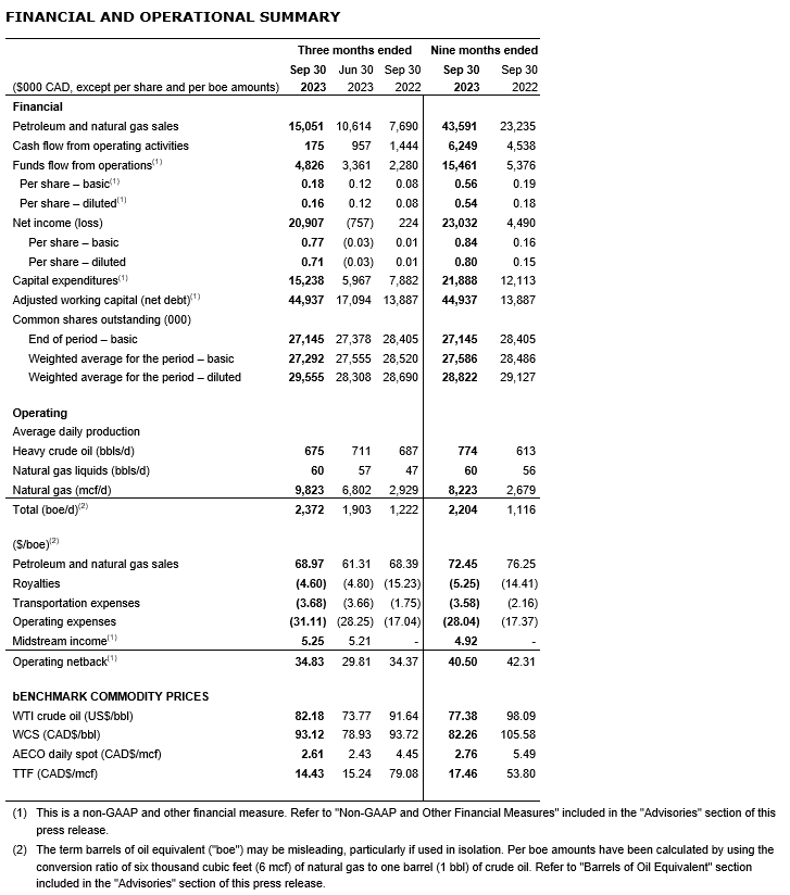 Completion and tie-in activities were completed on its four gross well (3.35 net) development program at the end of Q3 2023. All of the wells have been put on production, and gross production rates from the four wells are currently averaging 230 boe/d (87 per cent oil) per well, with the wells continuing to increase in production. For the first six weeks of fourth quarter 2023, the net production rate from the Leduc-Woodbend field has averaged approximately 2,000 boe/d.