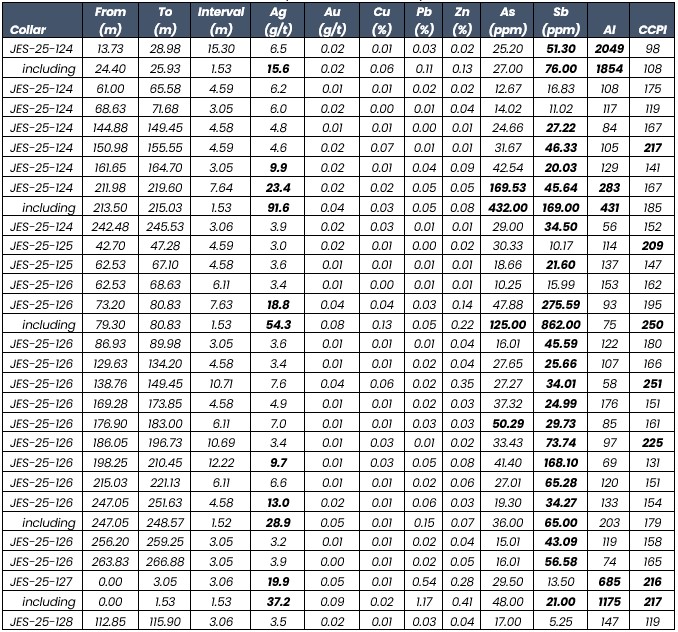 • Three of five drill holes intersected greater than one ounce per ton silver, across two targets 1.8 kilometres apart. Multiple additional intervals delivering three- to five-metre composites grading 15 to more than 20 g/t Ag, with coincident gold, zinc, lead and antimony enrichments. Results include 1.5 metres of 54.3 g/t Ag (JES-25-125) and 1.5 metres of 37.2 g/t Ag, 1.2 per cent Pb and 0.4 per cent Zn (JES-25-127).