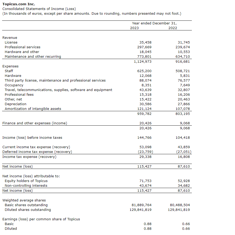 Topicus.com Inc., in a joint release with Constellation Software Inc., today released its financial results for Topicus.com for the fourth quarter and year ended Dec. 31, 2023. Please note that all amounts referred to in this press release are in euros unless otherwise stated.