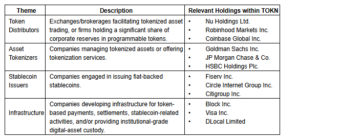 As part of its selection criteria, eligible securities within the Mirae Asset Stablecoins and Tokenization CAD Index are categorized into four themes. These themes ensure that