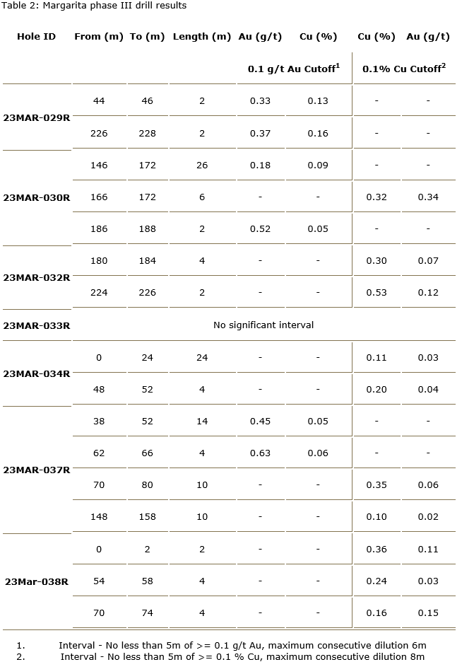 The company has also received the results from the remaining seven drill holes from the phase 3 drill program. While intersecting some zones of anomalous mineralization, the results did not materially add to the known information about the project. The company will continue to focus on the discoveries made at the Falla 13, Cototuda and Margarita structural corridors. In addition, the company will continue to refine its targeting based on the results from drill hole 23MAR-031R, where 42 m of 1.1 g/t gold and 0.48 per cent copper was intercepted from 246 m to 288 m in depth 200 m to the west of the original Falla 13 discovery. There was no geochemical anomaly present on surface, making this a blind discovery based on permissive geology. Results from the final seven drill holes of the phase 3 drill program are presented in an attached table.