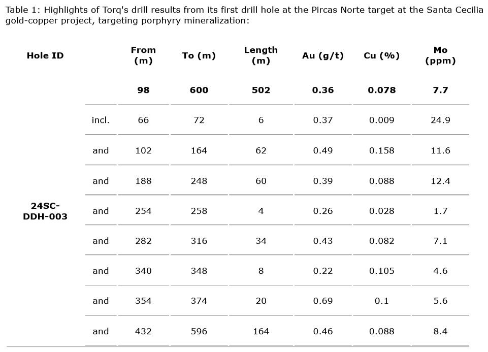 Torq Resources Inc. has released the first set of results from the recently completed phase II drill program at its Santa Cecilia project, located in the prolific Maricunga belt, in the Atacama region of Chile. The program consisted of approximately 1,500 metres (m) over three diamond drill holes; two located at the Pircas Norte target and one at the Gemelos Norte target. Drill hole 24SC-DDH-003 intercepted 0.36 g/t gold (Au) and 0.078% copper (Cu) over 502 m from 98 m down hole, including a higher-grade interval of 0.69 g/t Au and 0.10% Cu over 20 m from 354 m down hole at Pircas Norte (Table 1). The drill hole ended in mineralized intrusive diorite breccia due to logistical limitations and the reported intercept remains open. These results represent a new discovery of significant gold-copper porphyry mineralization and confirm the Company's exploration thesis for the broader Santa Cecilia project. Results from drill holes 24SC-DDH004 and 24SC-DDH005 are expected in the coming weeks.