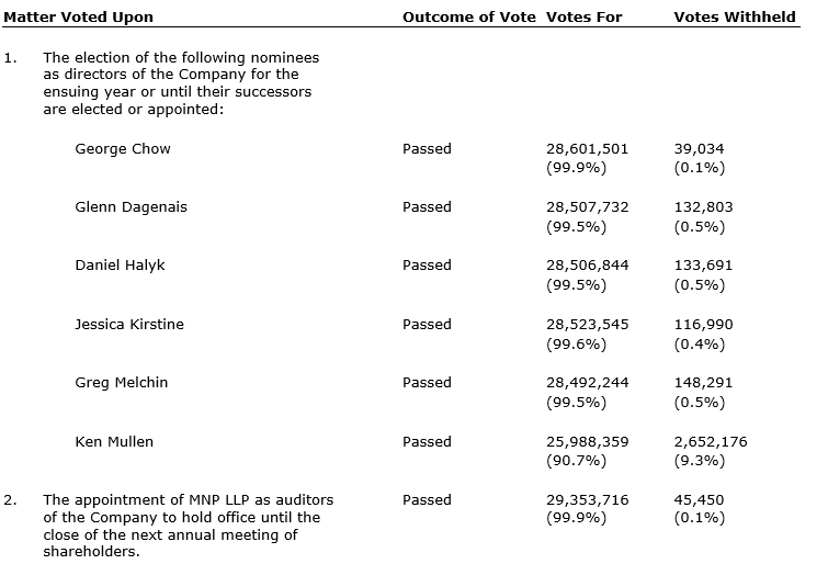 Matters were voted upon at Total Energy Services Inc.'s annual meeting of shareholders on May 16, 2023. A total of 29,399,166 common shares, representing 72.1 per cent of Total Energy's issued and outstanding shares as at the record date for the meeting, were represented in person or by proxy at the meeting.