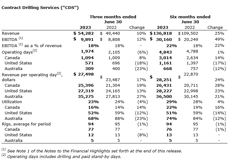 CDS (contract drilling services) segment revenue during the second quarter of 2023 was higher compared with the previous-year quarter as lower consolidated operating days were more than offset by increased pricing. The deployment of upgraded equipment in response to improving customer demand contributed to increased year-over-year second quarter revenue per operating day and utilization in Canada. Negatively impacting utilization in the United States was the transfer of a drilling rig to Canada during the second quarter of 2023 and a general slowdown in industry activity, which was offset by higher pricing. The removal of a drilling rig from service during the second quarter of 2023 for recertification and upgrades resulted in lower year-over-year utilization in Australia. Lower Australian utilization was partially offset by higher revenue per operating day as compared with the second quarter of 2022 due to rate increases arising from previous rig upgrades and fewer standby days due to wet weather in 2023 compared with 2022.