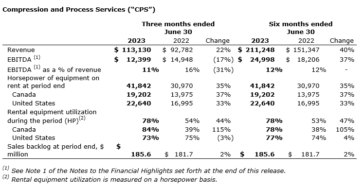 The year-over-year increase in the CPS (compression and process services) segment's second quarter revenue was due primarily to higher U.S. fabrication sales, increased equipment overhaul activity and increased utilization of the compression rental fleet. Excluding $7.4-million of contract cancellation revenue included in the second quarter of 2022, improved pricing on fabrication sales, increased overhead absorption due to higher production levels and higher rental fleet utilization all contributed to a year-over-year improvement in second quarter segment adjusted EBITDA and EBITDA margin, with second quarter adjusted EBITDA and EBITDA margin increasing 64 per cent and 22 per cent, respectively, for 2023 as compared with 2022. The fabrication sales backlog increased to $185.6-million, compared with the $181.7-million backlog at June 30, 2022. Sequentially, the quarter-end backlog decreased $41.8-million as the conversion of quoting activity to sales moderated somewhat during the second quarter with no corresponding decrease in production activity.