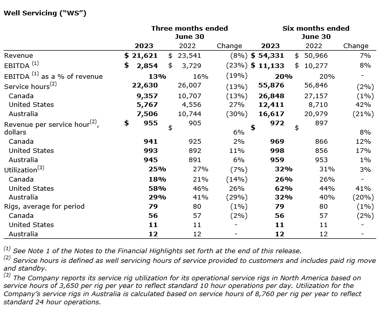 Second quarter activity in the Canadian WS (well servicing) segment was negatively impacted by reduced well abandonment activity following the conclusion of government incentive programs. Negatively impacting second quarter activity in Australia was the removal of a service rig from operation for recertification and upgrades. Partially offsetting lower activity in Canada and Australia was higher year-over-year activity in the U.S. Year-over-year increases in second quarter revenue per service hour in all jurisdictions also partially offset lower consolidated activity levels.
