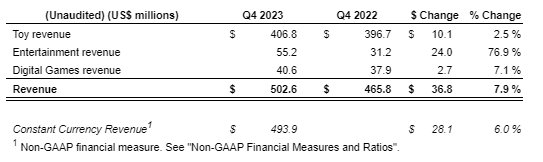 "We are very pleased with how our team navigated the challenging macroeconomic environment to deliver revenue growth in the 4th quarter," said Max Rangel, Global President & CEO. "We harnessed the strength of our three creative centres to meet our full-year revenue expectations. While our Toy revenue declined for the full year compared to 2022, our POS remained ahead of the industry2 and we grew market share globally, by introducing innovation into the toy aisle, engaging fans of popular franchises both licensed and owned, and growing our evergreen brands to create magical play experiences for-millions of children globally. We saw strong increases in Entertainment from the PAW Patrol movie and the delivery of the Unicorn Academy series, and we grew Digital Games revenue, highlighting the power of our diversified portfolio to drive long-term growth."