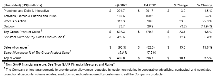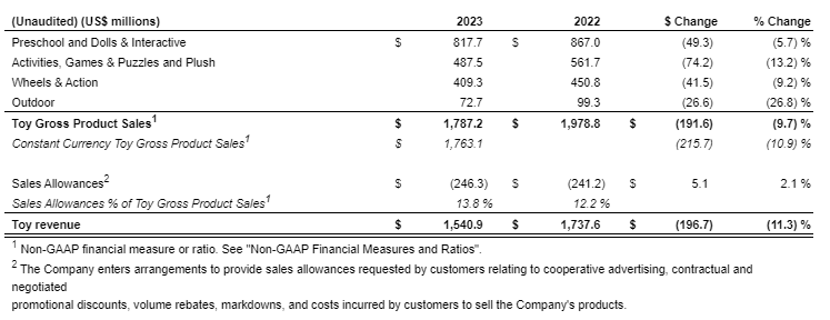 The following table provides a summary of preliminary Toy revenue, by product category, for the three months ended Dec. 31, 2023 and 2022: