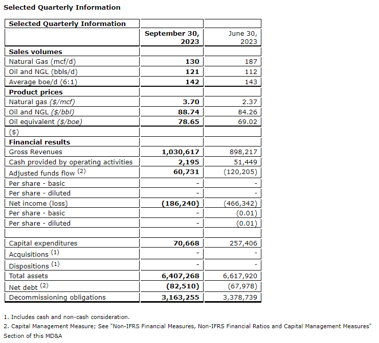 - Generated adjusted funds flow of $60,731 in Q3 2023 ($0.00 per basic and diluted share) a 151% increase compared to a deficit of $120,205 ($0.00 per basic and diluted share) in Q2 2023, and a 1,243% increase when compared to a deficit of $5,314 in Q3 2022 ($0.00 per basic and diluted share).