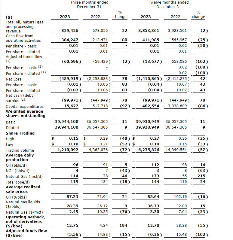 "The company achieved many accomplishments in 2023. It realized positive waterflood results in Murray Lake which led to shallower production declines and an increase in reserves and furthered its workover program with successful results in Hays which also lead to positive reserve additions. The company was also able to reduce operating costs on its two core operated areas of Hays and Murray Lake in H2 2023 which will become realized on a per boe basis once the company brings its curtailed production back on-line in mid-2024. The company will continue to prudently invest on its longer-term core assets and improve netbacks focusing on return on investments," said Cameron MacDonald, president and chief executive officer.