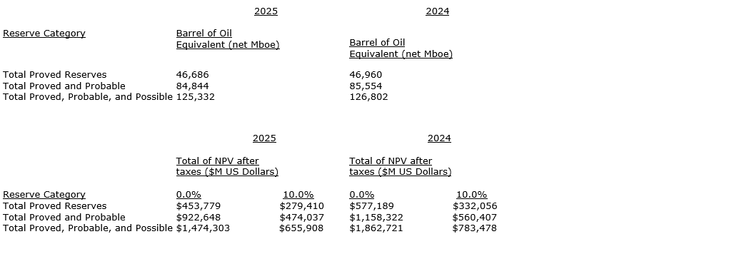 Tethys engaged McDaniel and Associates Consultants to provide a reserve report as of Dec. 31, 2025. This report has now been completed and was prepared in compliance with National Instrument 51-101, Standards of Disclosure for Oil and Gas Activities, and the COGE handbook. Over all, the total proved and total proved plus probable reserves are about the same as last year, but net present value (NPV) calculations are lower primarily due to lower oil prices. The total proved and probable NPV using a discount rate of 10 per cent is about $474-million, as compared with $560-million in 2024 (down about 15 per cent). The attached table is a summary from the report.
