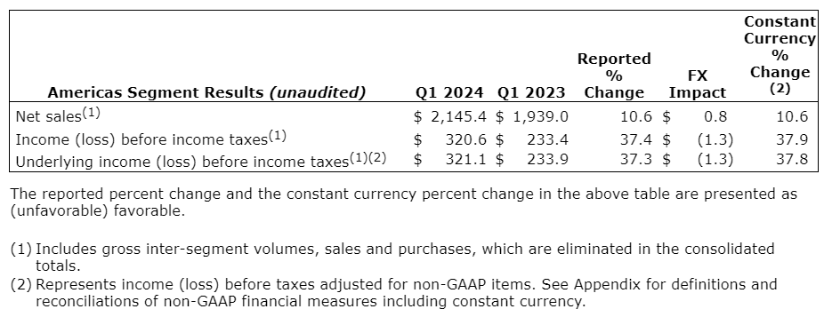 - The associated table highlights the Americas segment results for the three months ended March 31, 2024, compared with March 31, 2023.