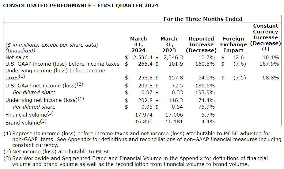 U.S. GAAP net income attributable to MCBC of $207.8-million, 97 cents per share on a diluted basis. Underlying (non-GAAP) diluted earnings per share (EPS) of 95 cents per share increased 75.9 per cent.