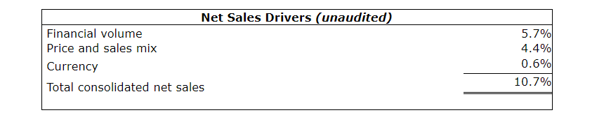 Net sales increased 10.7 per cent, driven by higher financial volumes, favourable price and sales mix, and favourable foreign currency impacts. Net sales increased 10.1 per cent in constant currency.