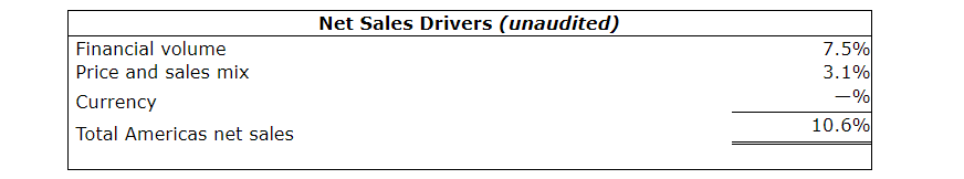 Net sales increased 10.6 per cent, driven by higher financial volumes and favourable price and sales mix.