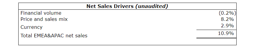 Net sales increased 10.9 per cent, driven by favourable price and sales mix, as well as favourable foreign currency impacts, partially offset by slightly unfavourable financial volumes. Net sales increased 8 per cent in constant currency.