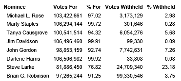 The resolution to appoint the eight nominees as directors of the company was passed on a vote by poll and each of the directors received votes for the election, as shown in the attached table.