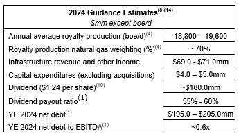 - Topaz Energy anticipates that the operators across its royalty acreage will continue to maintain 20 to 30 active rigs through 2024 and has established preliminary 2024 guidance estimates, subject to its key operators' final 2024 capital budgets and/or operational, or weather- or wildfire-related issues that may impact 2024 production. Topaz Energy estimates 2024 average annual royalty production of 18,800 to 19,600 boe/d and estimates its 2024 processing revenue and other income between $69.0-million and $71.0-million. Based on current commodity pricing and before consideration of acquisitions, Topaz Energy expects to exit 2024 with net debt between $195.0-million and $205.0-million.