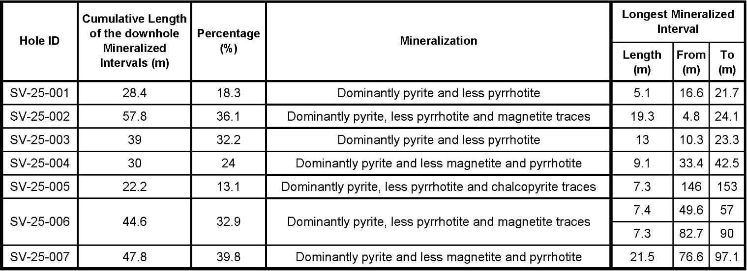 Drill holes SV-25-002, SV-25-007, SV-25-006 and SV-25-003 intercepted the longest cumulative mineralization intervals: