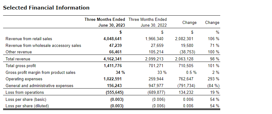 All-time high revenue of $4.05-million, a 106-per-cent increase from the comparative period in 2022, and a 47-per-cent increase from the three months ended March 31, 2023.