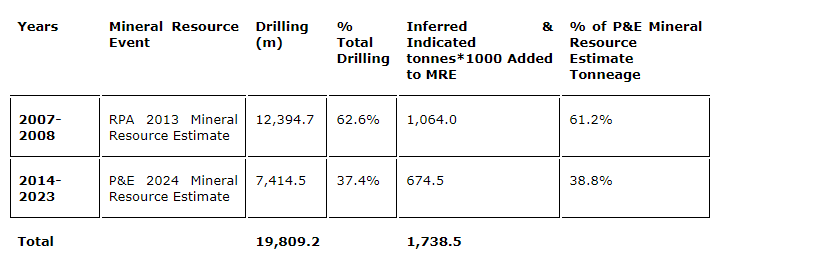 The attached table illustrates the history of exploration drilling at Thor by Taranis. In the first two years of drilling at Thor (2007 and 2008), 62.6 per cent of all drilling was completed. Just over 12,000 metres were drilled, which defined 61.2 per cent of the current mineral resource. All of the 2007 and 2008 drilling was completed in areas connecting five historical mines on the property -- proving that the mineralization in each was connected as part of a larger system. In the following 10-year period from 2014 to 2023, Taranis drilled a further 7,414.5 m on suspected extensions and newly discovered areas of mineralization, which successfully defined new areas of the mineral resource outside of the historical mine areas.
