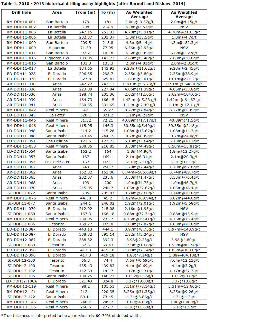 - Drill hole RM-DDH12-11 from Real Minera returned assays of 78.14 g/t Au and 12.66 g/t Ag over 3.31 m between 98.2 m to 101.51 m.