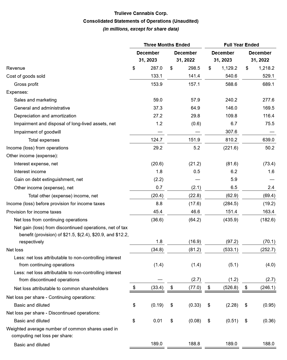 The Company's Form 10-K for the year ended December 31, 2023, will be available on the SEC's website or at https://investors.trulieve.com/quarterly-results. The Company's Management Discussion and Analysis for the period and the accompanying financial statements and notes will be available under the Company's profile on SEDAR and on its website at https://investors.trulieve.com/quarterly-results. This news release is not in any way a substitute for reading those financial statements, including the notes to the financial statements.