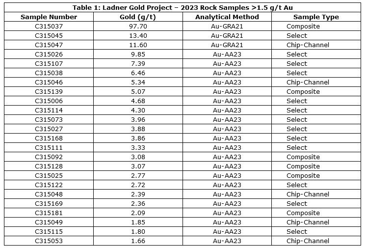 Rock samples at the Ladner project are collected from zones identified by Company geologists as likely hydrothermally affected. Three types of samples were collected during the 2023 campaign: Grab, Select, Composite, and Channel. Grab samples are taken to be non-selective and roughly representative of the outcrop / rock exposure. Select samples are chosen to highlight certain structures, mineralization, or alteration and may not be representative of the character or distribution of the local rock exposure. Composite samples are equivalent to Select samples, except that multiple structures, mineralized zones, or alteration zones from the same rock exposure have been combined into one sample. All channel samples during the 2023 Ladner program were collected as chip-channels whereby a manual or mechanical chisel was used to collect a 1-metre long, horizontal chip sample of approximately 3cm width and roughly 1cm depth. All samples are focused on an interval of interest such as a vein, zone of mineralization, or zone of alteration. Samples are a minimum of 500 grams in weight and averaged 1,786 grams during the 2023 program. Unmarked certified reference materials (CRMs and blanks) are inserted into the sample sequence and make up 11 per cent of the samples submitted to the lab for rock samples reported in this release. Sample preparation and analyses are carried out by ALS Global in North Vancouver, British Columbia, Canada. Rock sample preparation includes sample drying, fine crushing of the sample to at least 70 per cent passing 2 mm, sample splitting to 250 grams using a riffle splitter, and pulverizing the split to at least 85 per cent passing 75 microns (ALS code PREP-31). Gold in rock samples is analyzed by fire assay and atomic absorption spectroscopy (AAS) of a 30g sample (ALS code Au-AA23), while multi-element chemistry is analyzed using lab code ME-MS61 which is 4- Acid digestion of a 0.25 g sample split with detection by inductively coupled plasma mass spectrometer (ICP-MS) for 48 elements (Ag, Al, As, Ba, Be, Bi, Ca, Cd, Ce, Co, Cr, Cs, Cu, Fe, Ga, Ge, Hf, In, K, La, Li, Mg, Mn, Mo, Na, Nb, Ni, P, Pb, Rb, Re, S, Sb, Sc, Se, Sn, Sr, Ta, Te, Th, Ti, Tl, U, V, W, Y, Zn, Zr). Gold assay technique (ALS code Au-AA23) has an upper detection limit of 10 g/t. Any sample that produces an over-limit gold value via the gold assay technique is sent for gravimetric finish (ALS method Au-GRA21) which has an upper detection limit of 10,000 g/t Au.