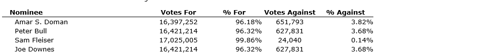All matters put forward for consideration at Tree Island Steel Ltd.'s 2025 annual general meeting of shareholders have received requisite shareholder approval. Results of the voting for the director elections at the meeting are described below and additional information regarding the full results of all matters voted on at the meeting may be found in the company's filing on SEDAR+.