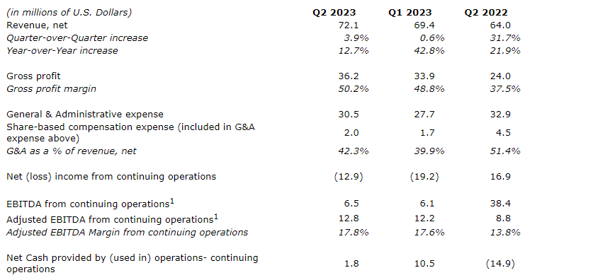 GAAP (generally accepted accounting principles) net loss from continuing operations was $12.9-million, compared with $19.2-million in Q1 2023 and net income of $16.9-million in Q2 2022.