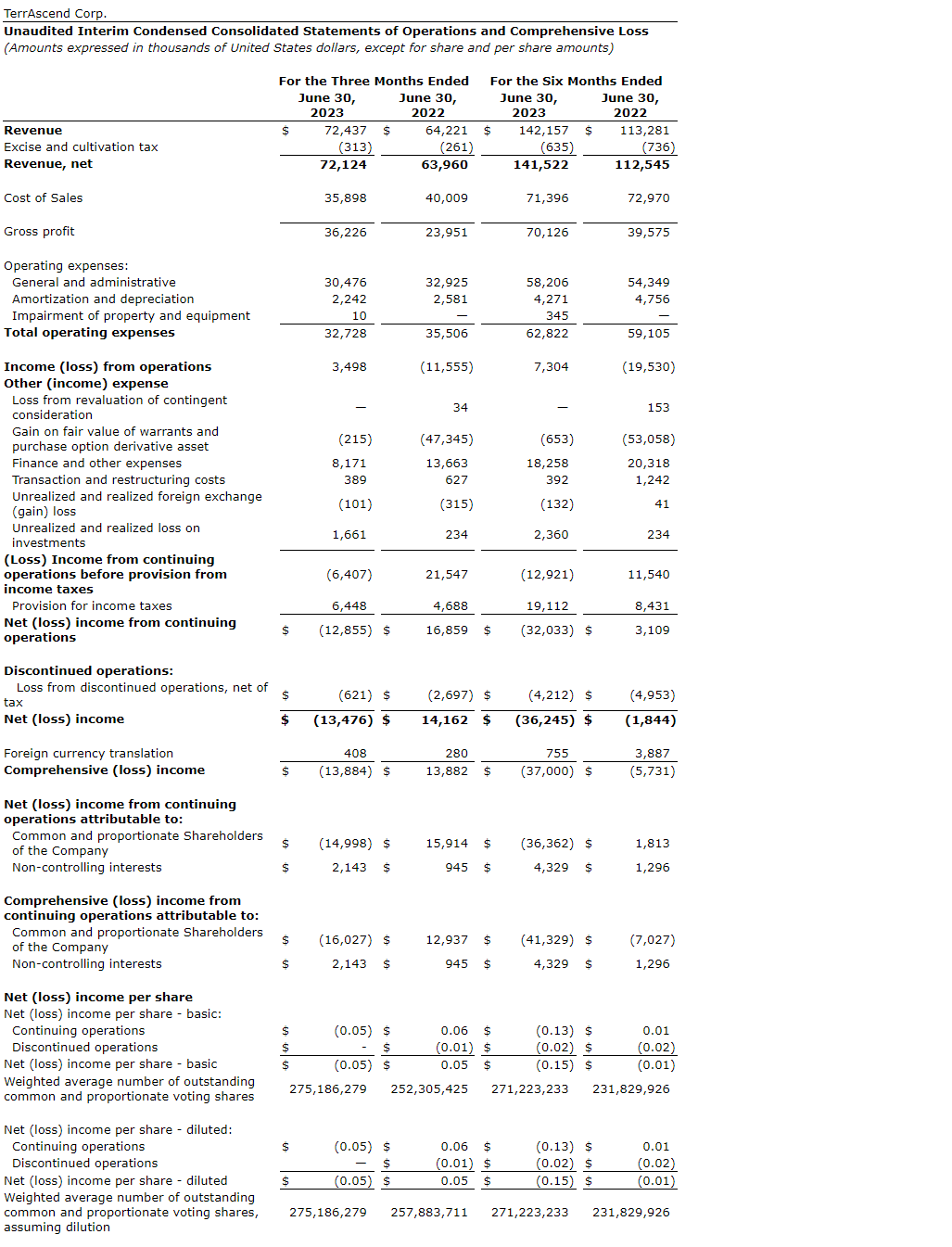 Terrascend Corp. has released its financial results for the second quarter ended June 30, 2023. All amounts are expressed in United States dollars and are prepared under U.S. generally accepted accounting principles (GAAP), unless indicated otherwise.