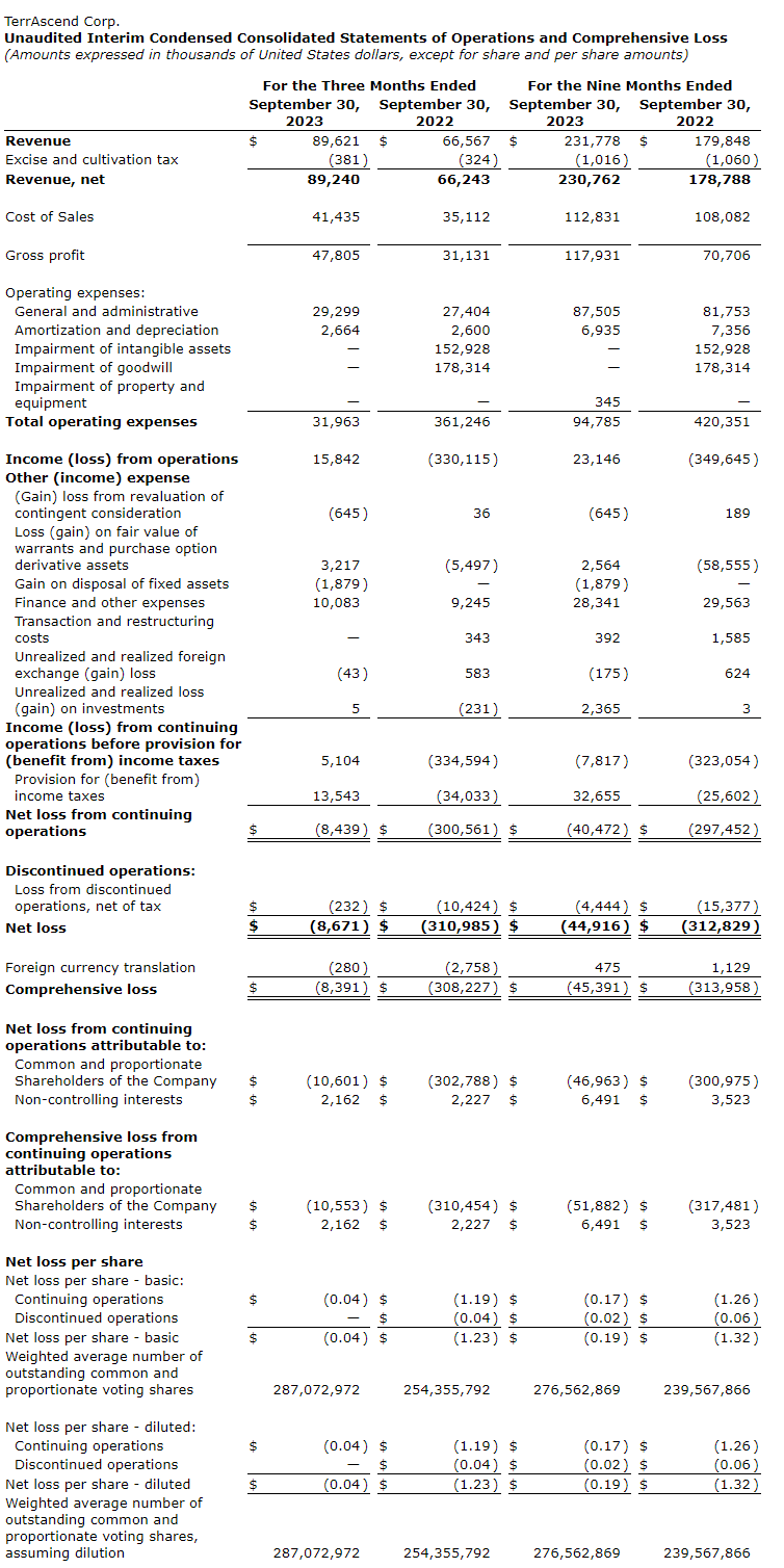 Terrascend Corp. has released its financial results for the third quarter ended Sept. 30, 2023. All amounts are expressed in U.S. dollars and are prepared under U.S. Generally Accepted Accounting Principles (GAAP), unless indicated otherwise.