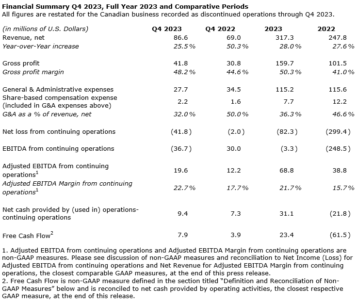EBITDA from continuing operations was ($3.3-million), compared with ($248.5-million) in 2022, including the aforementioned non-cash impairment charges of $58.0-million in 2023 and $311.1-million in 2022.