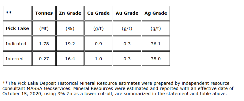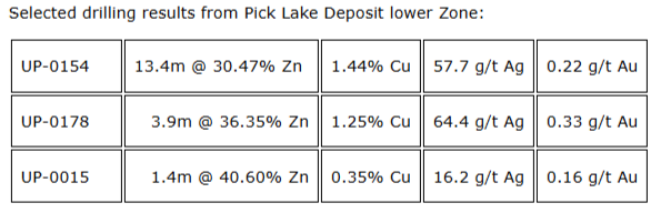 The Pick Lake deposit, within the Pick Lake critical mineral property, has an average strike length of approximately 250 metres and a depth extension tested between 300 to 1,200 metres. Mineralization at Pick consists of massive fine- to medium-grained sphalerite, pyrrhotite, with minor chalcopyrite and pyrite.