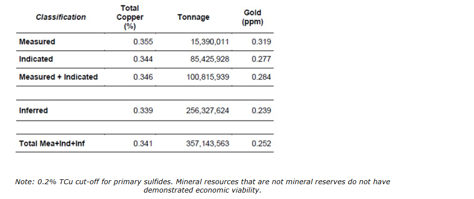 • Life of mine (LOM): 26-year operation producing 945,000 tonnes (2.1 billion pounds) of recovered copper and 1.5 million ounces of gold. Base case assumes a mining rate of 164,000 tpd (tonnes per day) and a processing rate of 35,000 tpd with metallurgical recoveries of approximately 88.2 per cent for copper and 64.6 per cent for gold.
