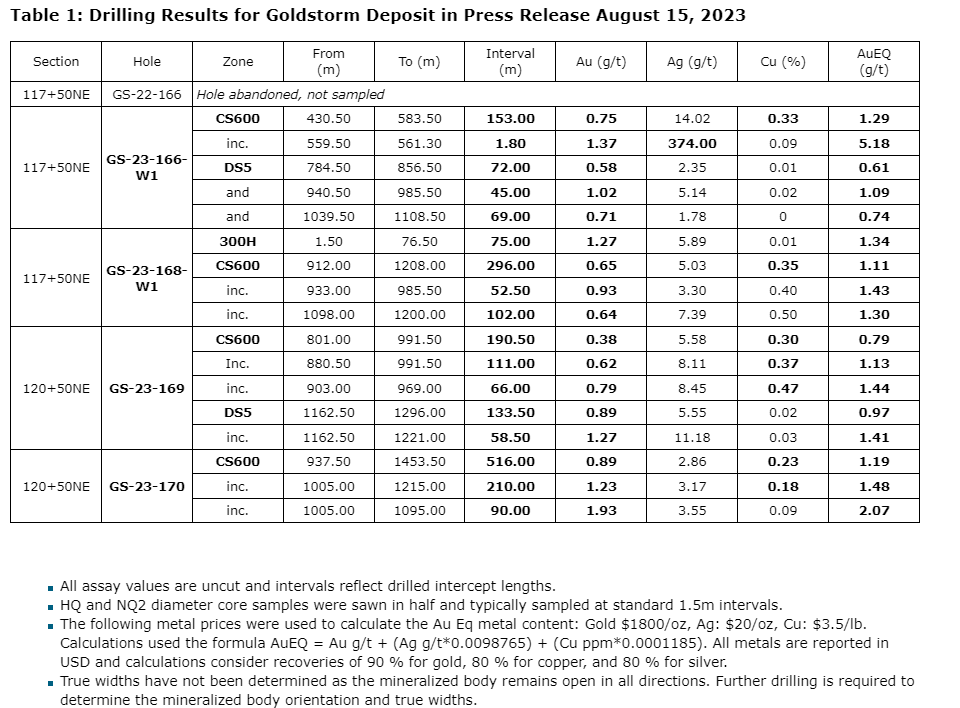 Ken Konkin, president and chief executive officer, comments: "We are very pleased to confirm the continued expansion of the Goldstorm deposit to the northeast. Results from our northeasternmost stepout drilling from Section 120+50 NE will certainly expand the volume of the deposit with gold equivalent values well above the 0.7 g/t [gram per tonne] AuEq underground resource estimate cut-off grade used for our deposit. In addition, very large blocks within the previously estimated drill inferred category have been successfully intersected with very positive gold, copper and silver grades, which we believe will convert these blocks of mineralization into the drill indicated category. Our goal is to increase the size of the resource without diminishing the grade. This will be a critical component to the preliminary economic assessment (PEA) that we plan to complete once we have totally defined the Goldstorm deposit. We have completed five additional drill holes on the Goldstorm deposit and three drill holes at the Perfectstorm target, which are currently in the lab. Results will be announced once they are received and compiled. Crews have begun construction of drill pads required to pursue the northern aspects of the CS-600, 300H and DS5 domains for the 2024 drill program; these are beyond the scope and the time available to drill within our planned 2023 program. Defining the shape and extent of each domain is necessary prior to determining a mine plan, which is essential for the PEA level and beyond."