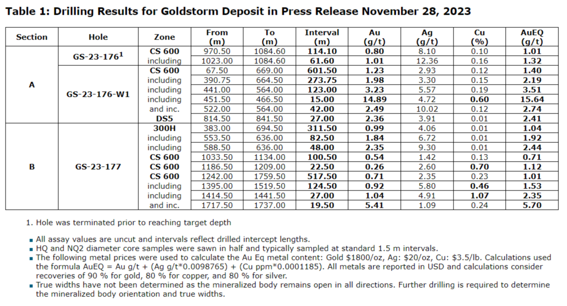 Ken Konkin, President and CEO, comments: "We are very pleased to announce the continuing expansion and definition of the Goldstorm domains in the northeastern sector of the Deposit. Three of the largest mineralized domains, including 300H, CS-600 and DS5, reported excellent results from these latest drill holes. The highlight of the 2023 program is the remarkable continuation of higher grades of gold, copper and silver throughout the northern aspect of the Goldstorm deposit. One of the best-looking mineralized areas of the Deposit to date is the lower CS-600 domain within GS-23-176-W1, which returned 273.75 m of 2.19 g/t AuEq (1.98 g/t Au, 3.30 g/t Ag, 0.15 per cent Cu) that includes an enriched central core that averaged 3.51 g/t AuEq (3.23 g/t Au, 5.57 g/t Ag, 0.19 per cent Cu) over 123.0 m. An interval of higher -than-average gold values was intersected near the end of GS-23-176-W1 that was associated with narrow quartz veinlets with minor disseminated pyrite; this is interpreted to be part of the DS5 domain, which may extend to greater depths than previously thought. If possible, we may extend this hole during the 2024 drill program to determine if there is a continuation to the lower 27 meters of mineralization that averaged 2.41 g/t AuEq near the bottom of this hole.