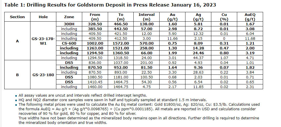 Ken Konkin, president and chief executive officer, comments: "We are very pleased to release the results from the last two drill holes of the 2024 drill program. We completed 33 holes this year of which eight were completed at the Perfectstorm system and 25 drill holes at the Goldstorm deposit. The objective of the Goldstorm drilling was to convert as much of the inferred mineral resources to the indicated mineral resource category as well as expand the deposit into the north where we have encountered the strongest gold-copper-silver mineralization to date. I congratulate our field crews and service contractors for completing yet another safe and successful season. Clearly the highlight of these last two holes is the impressive continuation of encountering higher Au-Cu-Ag grades than contained within our latest NI 43-101 mineral resource estimate for the Goldstorm deposit which hosts an indicated mineral resource of 23.37 million ounces of AuEq grading 1.13 g/t AuEq and an Inferred mineral resource of 7.35 million ounces of AuEq grading 0.98 g/t AuEq.