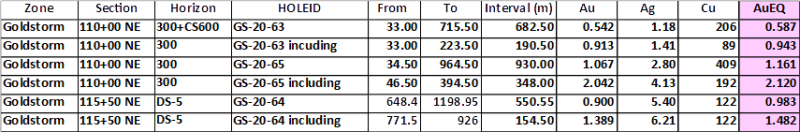Konkin adds "One of the most impressive aspects of the Goldstorm System is the consistent strength of the mineralization. Drill hole GS-20-64 was a steep-angled 150m step-out hole drilled to the northeast beyond the trace of the DS-5 intercept. This exploration hole targeted the extension of a very robust stockwork system that was intersected at the bottom of drill hole GS-19-47, 0.996 gpt AuEq over 243 meters (933.5 to 1176.5 meters). The intercept ended in mineralization at 1199m. The same DS-5 zone was intersected in GS-20-64 that doubled the intercept length from 243 meters to over 550 meters averaging 0.983 gpt AuEq (648.4 to 1198.95 meters) which is extremely consistent with the results obtained in GS-19-47. An enriched, upper portion of the stockwork system yielded 1.482 gpt AuEq over 154.5 meters (771.5 to 926.0 meters). We are currently re-drilling drill hole GS-19-47 as the system may be much larger than originally thought given the results obtained from the 150m northeast step out hole GS-20-64. The target is to drill through the entire stockwork profile that was discovered in 2019."