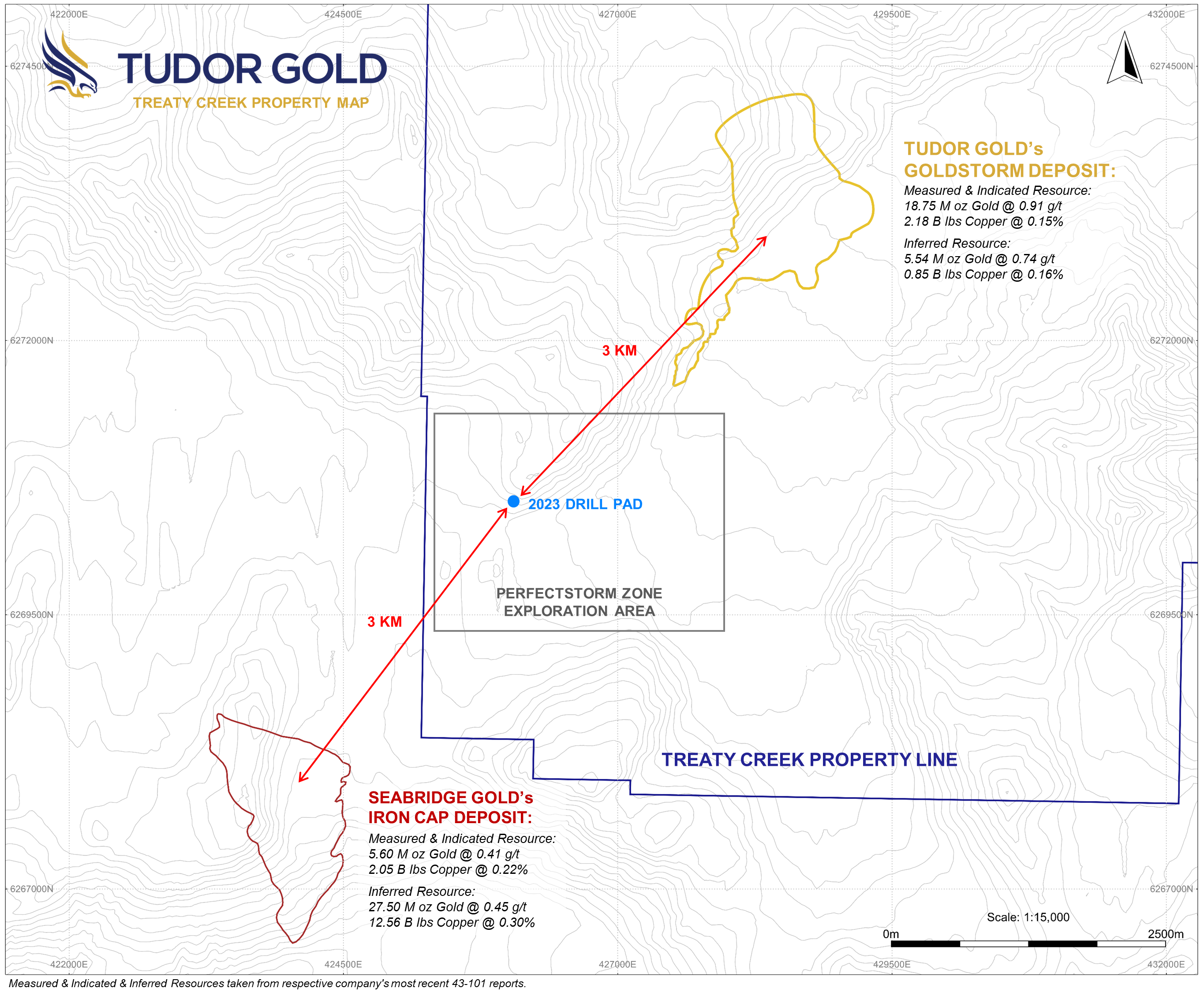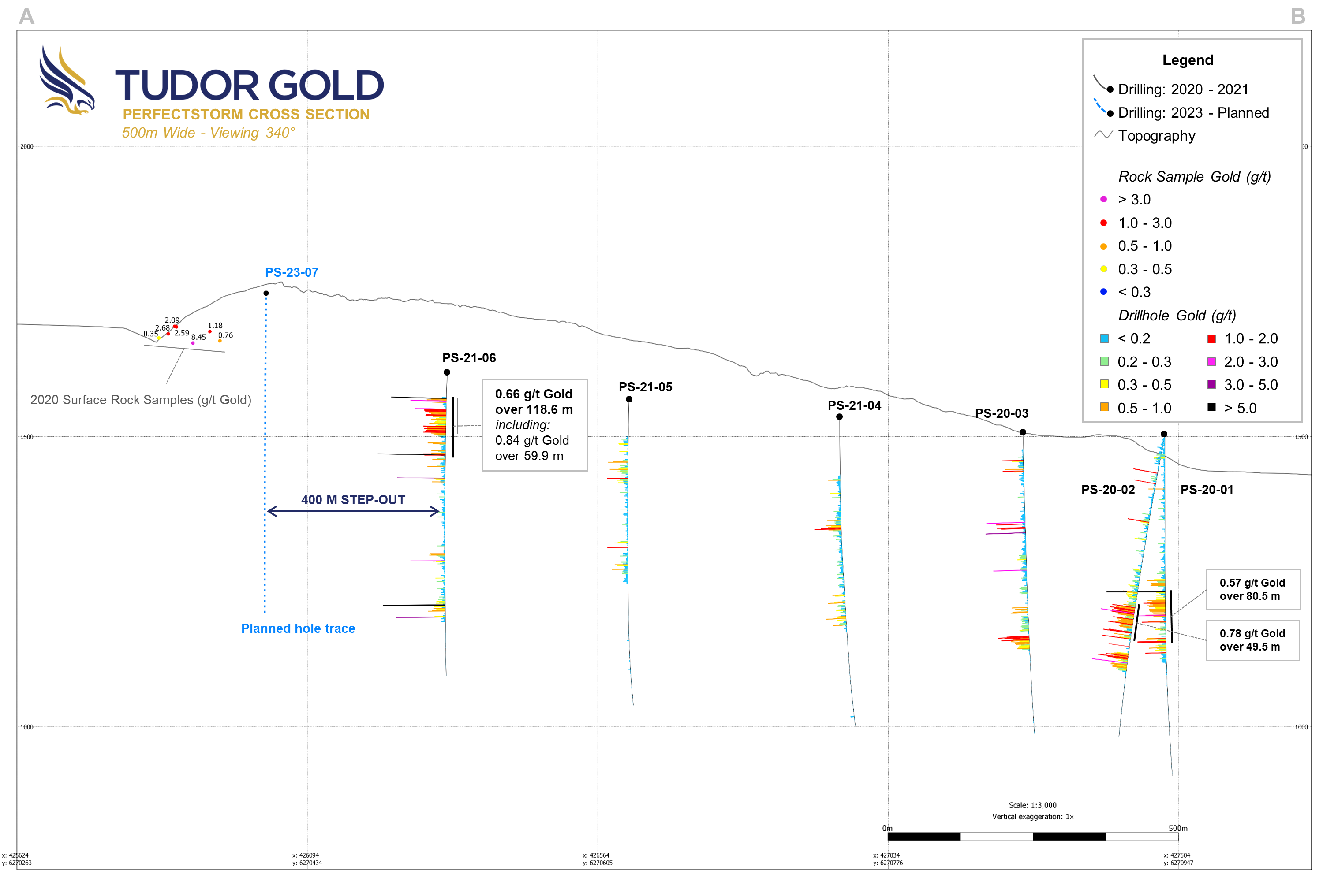 Ken Konkin, President and CEO of Tudor Gold , commented as follows : “We are very excited to begin drilling at Perfectstorm, which is positioned equidistant between Tudor Gold's Goldstorm Deposit and Seabridge Gold's Iron Cap Deposit (see URL “TCPlanView” at end of release). Drilling at Perfectstorm will build upon the progress made through previous initial drilling of six wide-spaced drill holes spanning a strike length of 1.3 kilometers. These holes successfully intercepted substantial widths of favorable gold, silver, and copper mineralization. Notable results include hole PS-21-06, which encountered 118.6 m averaging 0.66 g/t gold. These results include an uppermost portion averaging 0.84 g/t gold over 59.9 m. Given that only a small portion of the targeted magnetic anomaly has been explored at Perfectstorm, there is immense potential for a significant expansion of the mineralized area, thus making it a valuable addition to the Treaty Creek Project. The first of several planned drill holes will be collared at least 400 m west and west-northwest of PS-21-06 over the best surficial gold-geochemical rock sample results obtained from our last two years of surficial mapping and sampling programs.