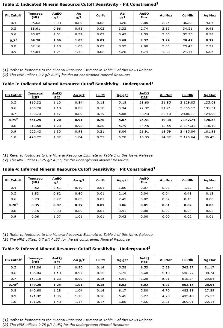 - Advanced metallurgical studies and refined the pit constrained and underground cutoff grades, increasing the pit constrained cutoff from 0.5 to 0.7 g/t AuEQ and the underground cutoff from 0.7 to 0.75 g/t AuEQ.