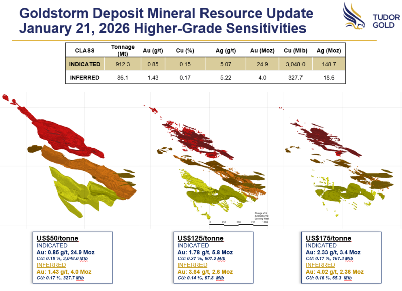 “The 2026 MRE increased Indicated Mineral Resources of gold at Treaty Creek’s Goldstorm Deposit by 15% over the 2024 Mineral Resource estimate and demonstrates the higher-grade potential at the Treaty Creek Project with higher NSR cutoff value sensitivities,” commented Joe Ovsenek, President and CEO of Tudor Gold.  “Now that we have the 2026 MRE in hand, we can start to advance our strategy for placing Treaty Creek in production with an underground mine initially targeting roughly 300,000 ounces of gold per year.   Metallurgical testing is underway, and we have started the process of developing a mine plan around the higher-grade mineralization at the Goldstorm Deposit.  As the metallurgical testing and mine planning come together, we will assess the potential for the completion of a preliminary economic assessment later this year.”