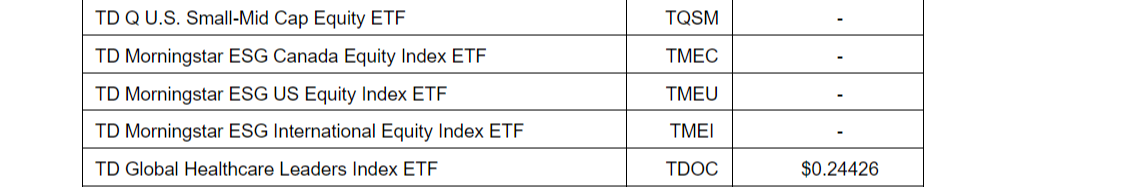 Unitholders of record on Dec. 29, 2023, will receive a notional distribution at year-end representing realized capital gains within the TD ETFs for the 2023 tax year. A notional distribution is when the units from a reinvested distribution are immediately consolidated with the units held prior to the distribution and the number of units held after the distribution is identical to the number of units held before the distribution.