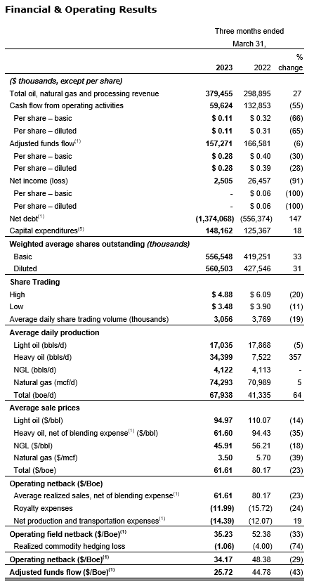 Tamarack Valley Energy Ltd. has released its financial and operating results for the three months ended March 31, 2023. Selected financial and operating information is outlined herein and should be read with Tamarack's consolidated financial statements and related management's discussion and analysis for the three months ended March 31, 2023, which are available on SEDAR and on Tamarack's website.