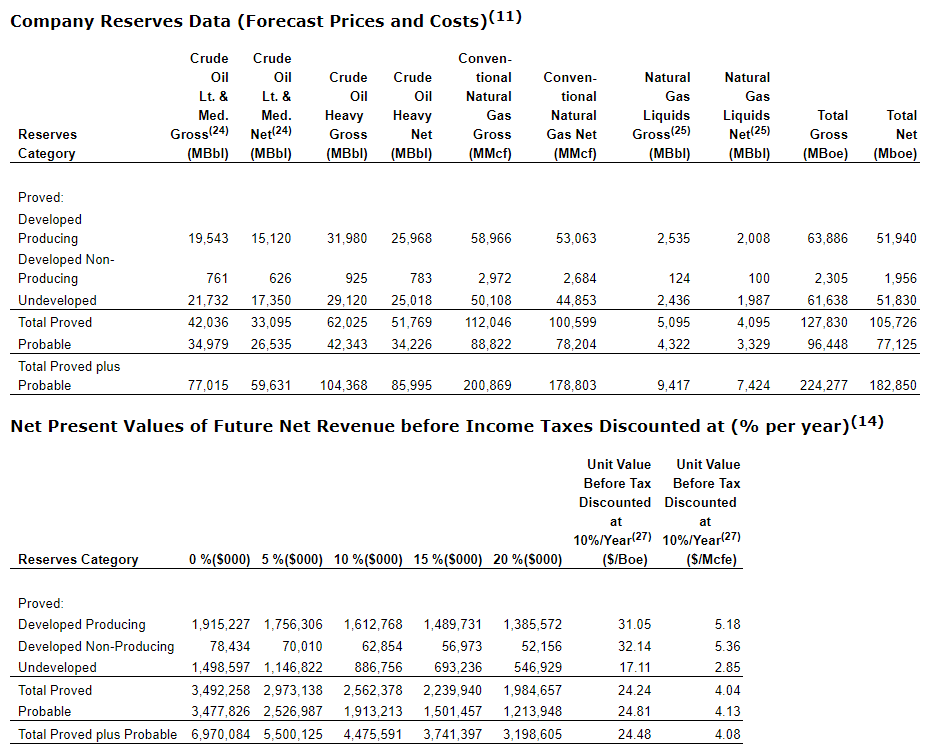 The associated tables highlight the findings of the reserve reports, which have been prepared in accordance with definitions, standards and procedures contained in National Instrument 51-101 -- Standards of Disclosure for Oil and Gas Activities (NI 51-101), and the most recent publication of the Canadian Oil and Gas Evaluation Handbook (COGEH) by McDaniel and GLJ, qualified independent reserves evaluators, each with an effective date of Dec. 31, 2023, and preparation dates of Feb. 9, 2024, and Jan. 29, 2024, respectively. All evaluations and summaries of future net revenue are stated prior to the provision for interest, debt service charges, or general and administrative expenses, and after deduction of royalties, operating costs, estimated well abandonment and reclamation costs, and estimated future capital expenditures. The information included in the "Net present values of future net revenue before income taxes discounted" table is based on an average of pricing assumptions prepared by the following three independent external reserves evaluators: GLJ, Sproule Associates Ltd. and McDaniel. It should not be assumed that the estimates of future net revenues presented in the associated tables represent the fair market value of the reserves. All per-share reserves metrics below are based on basic shares outstanding as of Dec. 31, 2023. Note that columns may not add due to rounding.
