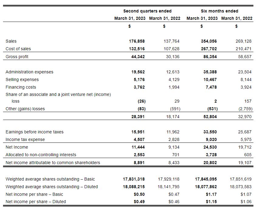 Net income for the second quarter and six months ended March 31, 2023 were $11,444 and $24,530 versus $9,134 and $19,712 for the prior comparable periods. This represents increases of 25% and of 24% respectively, which is a result of higher sales for TerraVest's base porfolio of businesses and the positive contribution of GES, MTC and TSX. The increases were partially offset by additional financing cost incurred, as a result of higher interest rates versus the prior comparable periods and increased debt levels to support working capital needs and finance business acquisitions. Other variances are also highlighted in the table above.