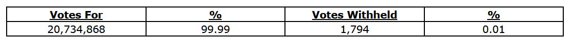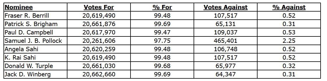 The eight (8) nominees proposed by management were elected as Directors of the Corporation to hold office until the termination of the next annual meeting of Shareholders or until their successors are duly elected or appointed, subject to the provisions of the Corporation's by-laws. Proxies were received on this matter as follows:
