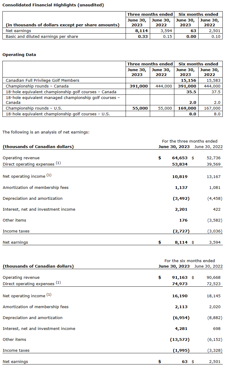 Net operating income for the Canadian golf club operations segment decreased to $10,289,000 for the three-month period ended June 30, 2023, from $12,675,000 in 2022 due to the conclusion of ClubLink's lease of The Country Club, which expired as of Dec. 31, 2023.