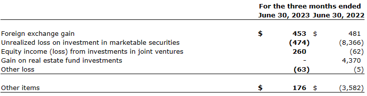 At June 30, 2023, the company recorded unrealized losses of $474,000 on its investment in marketable securities (June 30, 2022 -- $8,366,000). This loss is attributable to the fair market value adjustments of the company's investment in Automotive Properties REIT.