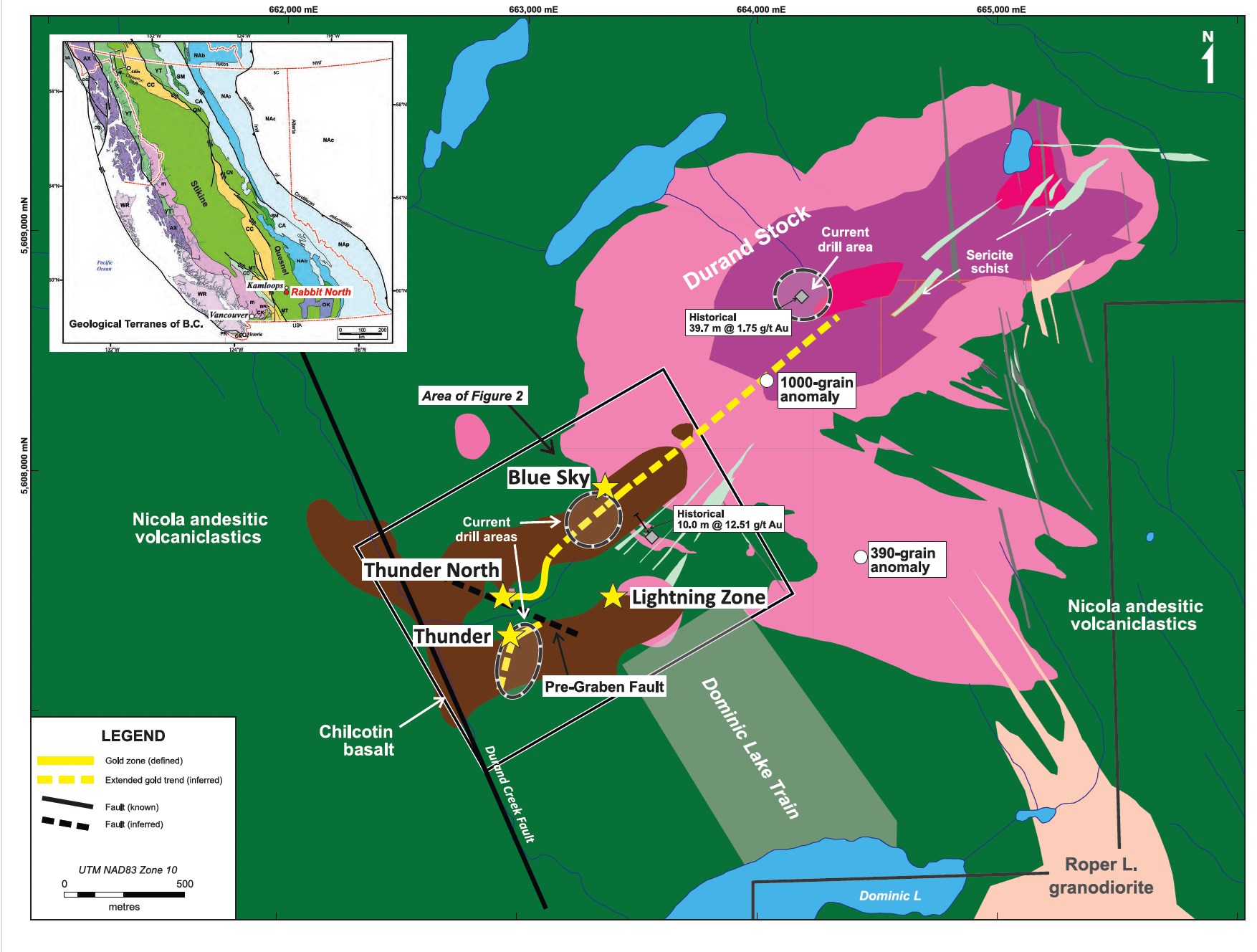 The main focus will be on closing the untested gap between the Thunder North and Blue Sky gold zones and extending the Thunder zone westward. A historical gold intersection 1 km northeast of Blue Sky will also be investigated. All but the latter target are "blind" because the gold-hosting Mesozoic basement rocks are covered by both glacial till and Miocene basalt lava flows.